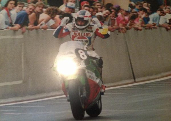 Dat was in 1986, de laatste keer dat de 24 uren van Montjuïc verreden zou worden. Doordat het evenement dat jaar in oktober plaats vond hadden we nagenoeg geen teamleden beschikbaar. De reis begon met 2 Hanomag busjes samen met andere rijder Mario Eikelenboom. Helaas ging de voorruit van zijn bus in Luxemburg geheel eruit zodat alles in1 bus met caravan moest worden overgeladen en we met maximaal 80km per uur verder naar Barcelona moesten rijden. Daar was inmiddels monteur Jeroen Lohr per motor aangekomen samen met zus lief Marlize, hetgeen het complete team was. Het resultaat was echter sensationeel daar we tot 30 seconde voor het einde van de laatste training op pole stonden voor de fabrieks Suzuki´s en de topfavoriet, de fabrieks Ducati. Slechts Juan Carriga, de latere GP 500 Cagiva rjider ging er toen nog 0,1 seconde onderdoor met zijn Ducati. Helaas reed Mario in de wedstrijd een strobaal doormidden waardoor we helaas na 7 uren uitvielen.
