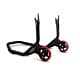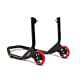 This model of rear stand is developed to be the stronghest stand in VMC line. Is made with strong steel with two reinforcement on both arms. It is painted with a special embossed long life powder coating. Is equipped with four red/black large wheels VMC designed for more strenght. It can be used with all kind of stand spools and the width can be manually adjusted to fit with all racing bikes.