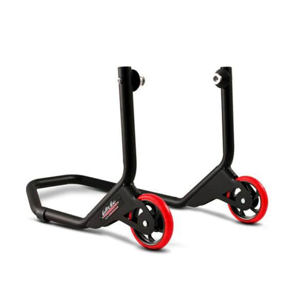 This model of Race Endurance rear stand is made with steel and painted with a special embossed long life powder coating. Is equipped with two red/black large wheels VMC designed. It must be used with special forks adapters mounted on rear bike swingarm and the width can be manually adjusted to fit with all racing bikes.