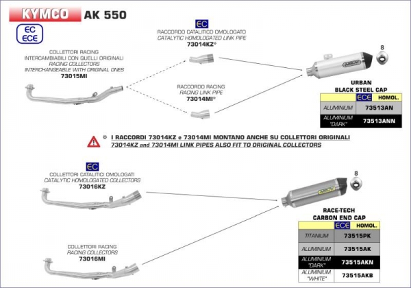 This system 73015MI is not EU approved and fits both the Arrow mufflers/linkpipe and the original ones.