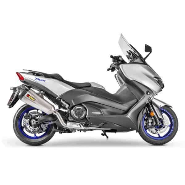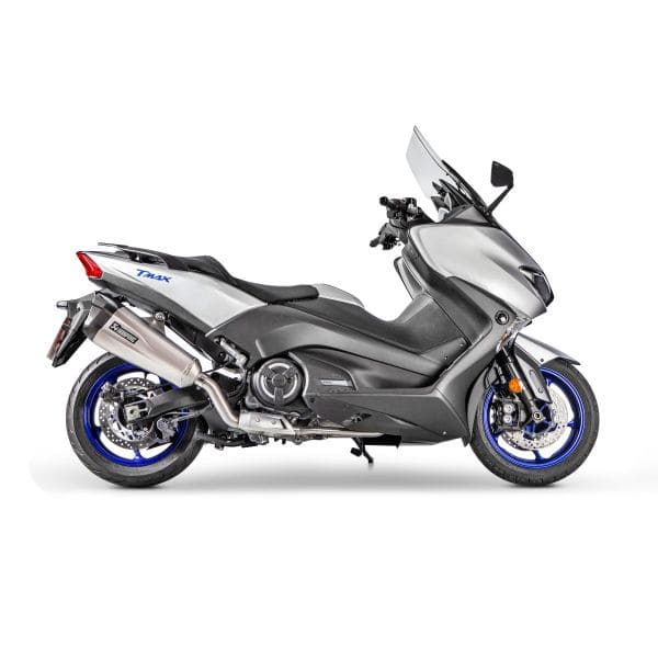 Developed from a concept that was first aired at EICMA 2015, the Racing Line (Titanium) fits perfectly within the sporty lines of the Yamaha TMAX. This ultimate sports maxi scooter already has a presence on the road, and the addition of this stunningly designed Akrapovič exhaust system will take it to new aesthetic heights as it perfectly enhances the TMAX’s design. The unique shape of the muffler, with its embossed Akrapovič logo imprints that run all the way along the exhaust and blend in seamlessly with the hand-crafted carbon fibre endcap, takes design to new levels and demonstrates that the Slovenian exhaust specialists are constantly looking towards the future with their innovative and high-tech exhaust technology. To compliment the stunning looks, the Racing Line exhaust system also delivers more power than the stock system, and the use of high-grade lightweight material means it also has a significant weight saving, which aids handling. The impressive visual appearances and improved performance are further boosted by an exclusive Akrapovič sound that is perfectly tuned to provide ideal aural desirability. With simple plug-and-play installation and EC/ECE–compliant, this is a system that takes the Yamaha TMAX to an unrivalled position in the maxi scooter market.