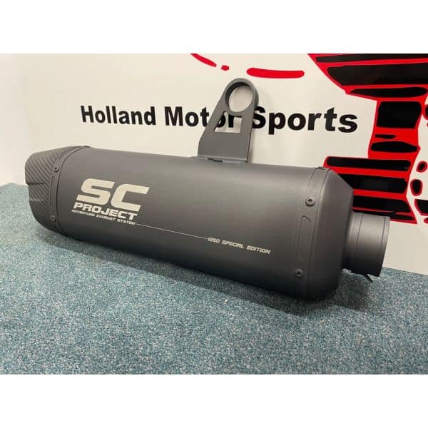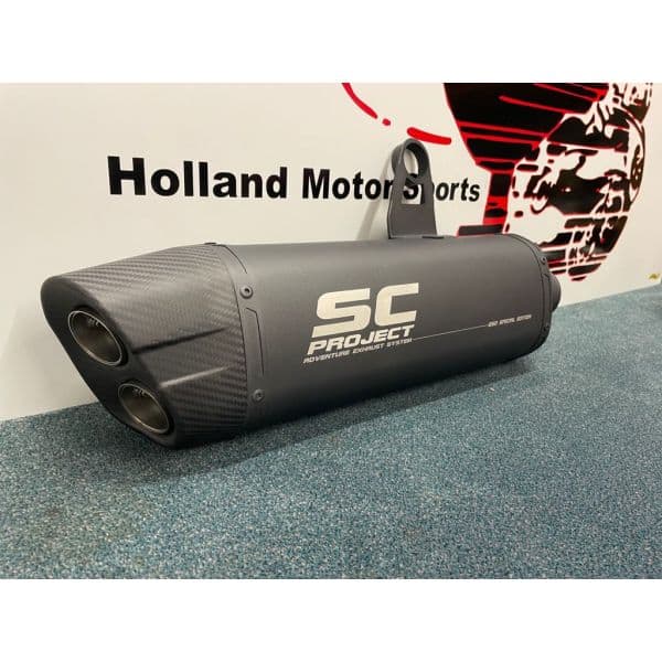 SC project Titanium grijze adventure uitlaat demper met een carbon end cap.