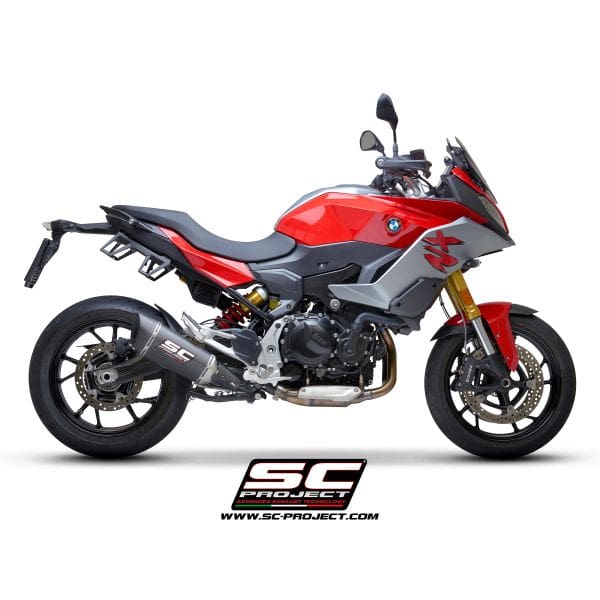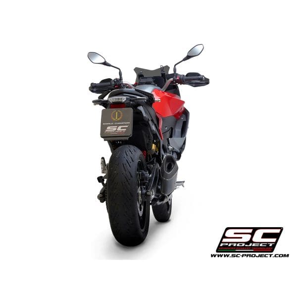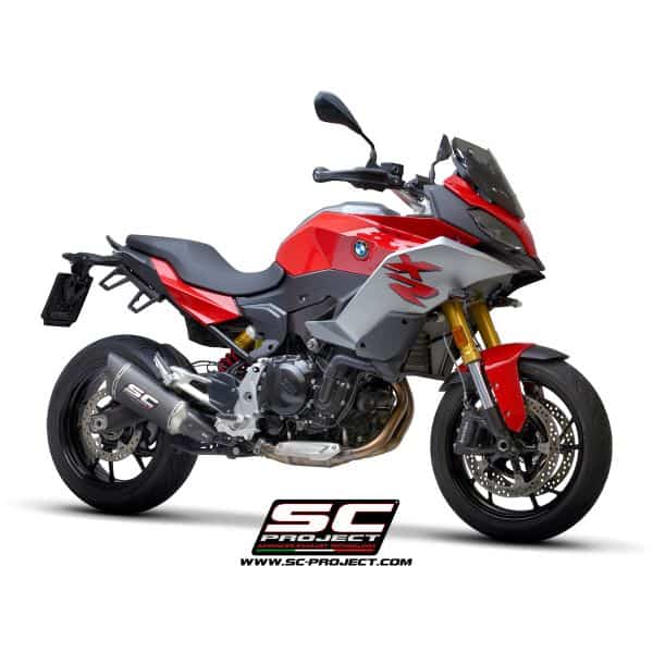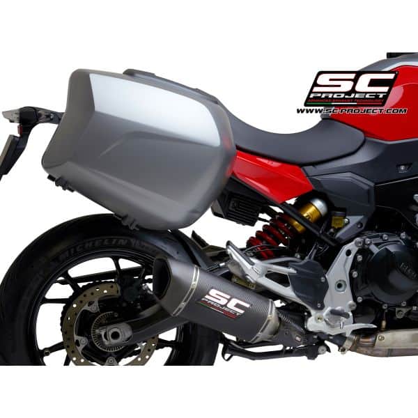 The SC1-R muffler represents the maximum technological expression that can be mounted on BMW F900R and XR. Derived directly from the SBK, extreme performance and shapes made especially for your BMW. Its outlet is obtained by hydroforming in titanium, its carbon end cap is made in an autoclave and available with an external body in titanium or carbon. The welds of the bracket and the fitting are produced with T.I.G. technology, the sound-absorbing material is designed to withstand extremely high temperatures. The sound is unique. Together with the silencer, a black pre-chamber (obtained with ceramic paints resistant to very high temperatures) is provided, specifically designed to reduce the shape of the muffler as much as possible, and made to fit in the best way with the design of the motorcycle. The muffler is EURO5 approved. It comes with a specific carbon protection made in an autoclave. The muffler has a system that allows installation in two different positions: high, for a sport position, or low if the original right side bag is used. This adjustment is possible in a very simple and fast way.
