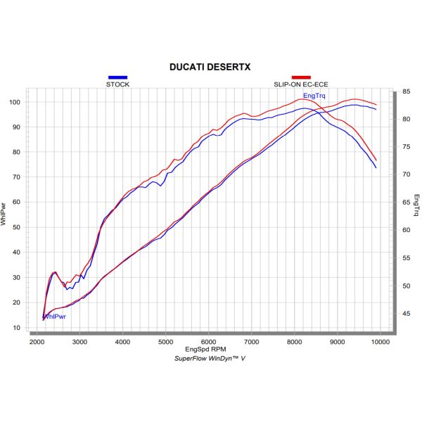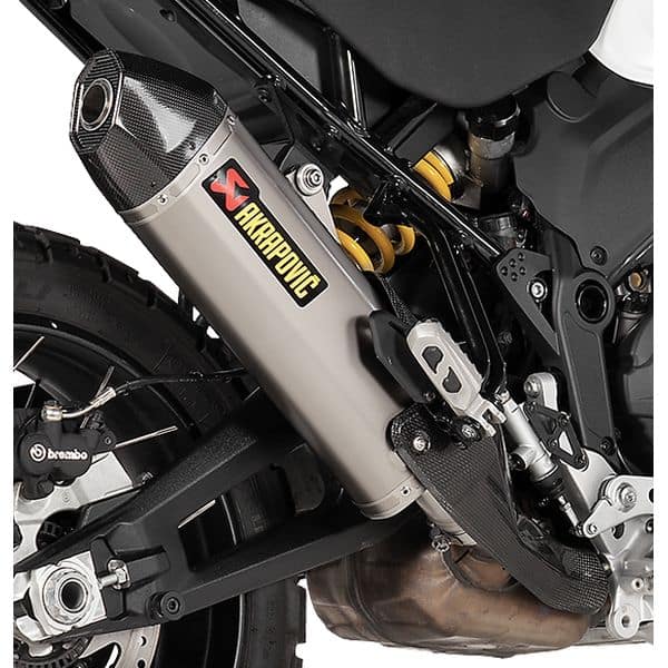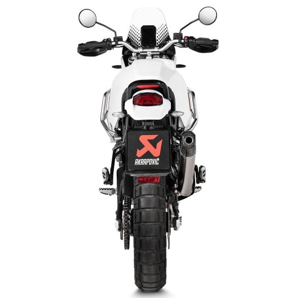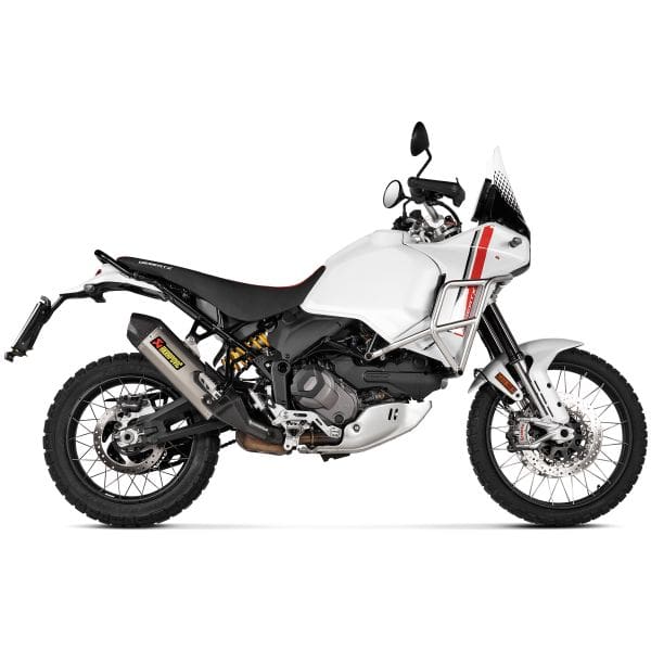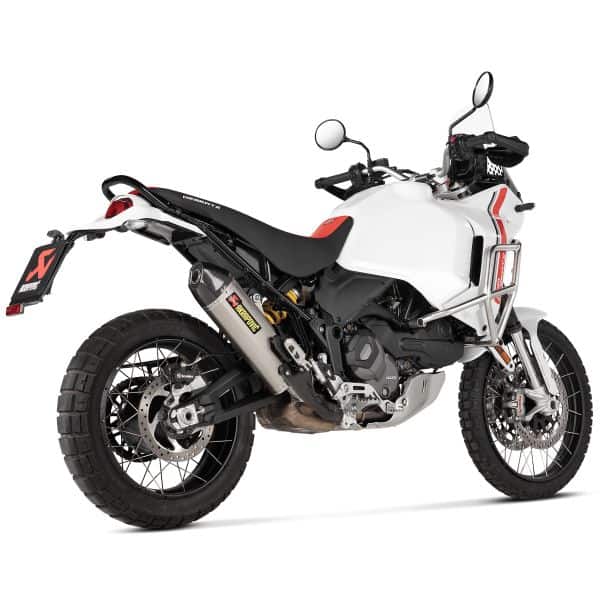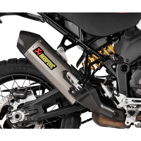 The muffler outer sleeve is made from high-grade titanium, with a stainless-steel link pipe and muffler inner structure. Finished with a carbon-fibre end cap and heatshield, this exhaust reduces weight by 33.4% (1.1 kg). The new design offers great durability and personalization for the motorcycle. With a heatshield that has been totally designed from scratch, the package provides passenger and gear protection, while delivering a unique appearance. Power gains of 1.8 kW (2.4 hp) at 9,400 rpm and torque increases of 1.8 Nm at 8,100 rpm – when compared to a Ducati DesertX equipped with the standard stock system and tested on the Akrapovič in-house dyno – combine with a perfect throttle response. A deep, vivid, and sporty sound is emitted from the exhaust, which has an EC/ECE type-approval certificate and is a simple plug and play installation with no remapping needed.