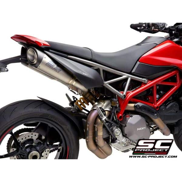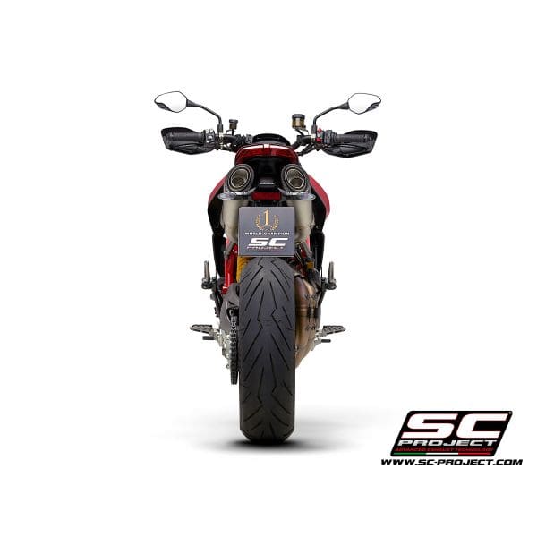 The S1 muffler represents for SC-Project the perfect combination of lightness and performance without compromise. Its conical shape with taut and essential lines make the S1 silencer fascinating giving outburst to Your Ducati Hypermotard 950. Born from the experience of the racing department on the circuits of the WSBK Championship, the silencer has a Titanium, Titanium Matt Black body with Carbon end cap with a special sound-absorbing material that resists high temperatures. The Matt Black version is obtained by ceramic-based painting resistant to very high temperatures. To make it unique and unmistakable our Technicians have used the best production processes: brackets and fittings welded with T.I.G. technology, the insert bushings in titanium made in CNC and lasered Logo. From the high and powerful sound the S1 silencer will make the Sound of Your Moto unique.
