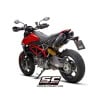 SC1-M, derived from the iconic muffler SC1. The new SC1-M was developed by the R&D department for the medium-powered motorbike. Short, compact and modern for those who prefer minimal shapes. The new end cap carbon-fiber Twill with a decisive and strong character adapts well to the shapes of the Ducati Hypermotard 950. The metallic part of the exit section has been designed to integrate better with the sportive design of the carbon end cap. The muffler is equipped with DB-killer and its specific block system. The muffler is EURO 4 homologated. The external part is supplied in Carbon edition. The fixing clamp to the chassis is made in painted Stainless Steel Aisi 304.