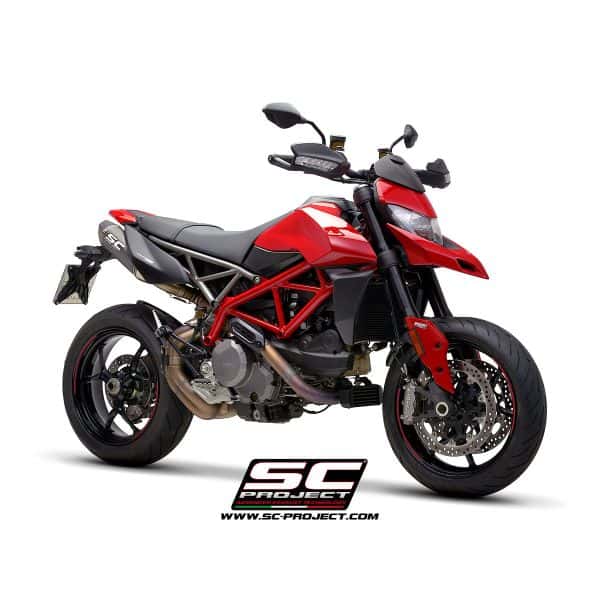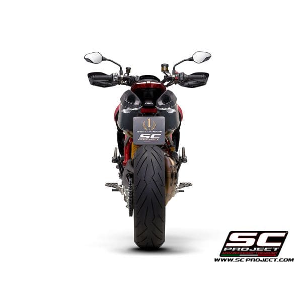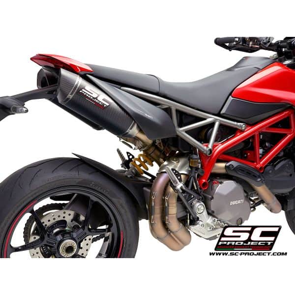 SC1-M, derived from the iconic muffler SC1. The new SC1-M was developed by the R&D department for the medium-powered motorbike. Short, compact and modern for those who prefer minimal shapes. The new end cap carbon-fiber Twill with a decisive and strong character adapts well to the shapes of the Ducati Hypermotard 950. The metallic part of the exit section has been designed to integrate better with the sportive design of the carbon end cap. The muffler is equipped with DB-killer and its specific block system. The muffler is EURO 4 homologated. The external part is supplied in Carbon edition. The fixing clamp to the chassis is made in painted Stainless Steel Aisi 304.