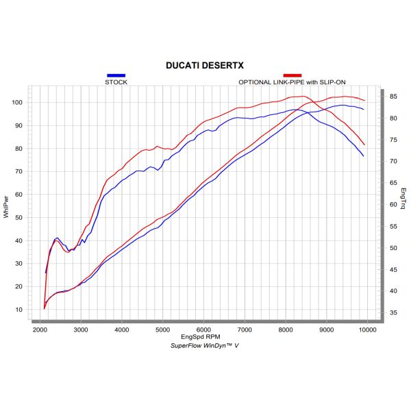 Constructed from high-grade stainless steel, this newly developed link pipe replaces the stock pre-muffler, where the stock catalytic converter is located, leading to a more direct gas flow, aimed at increasing performance. Providing a huge weight reduction of 79.2% (3.8 kg) over the original link pipe, this option also increases power by 3.2 kW (4.4 hp) at 8,600 rpm and improves torque by 5.6 Nm at 4,600 rpm when fitted to a Slip-On Line (Titanium) on a Ducati DesertX and compared with the standard stock system on the Akrapovič in-house dyno. Serving up an enhanced sportier racing sound, this track-oriented optional part has no EC/ECE type-approval and has been developed for use on closed-course competition circuits only. It is a simple plug-and-play installation, and remapping of the ECU is recommended.