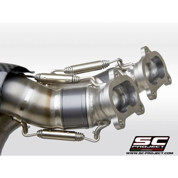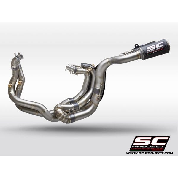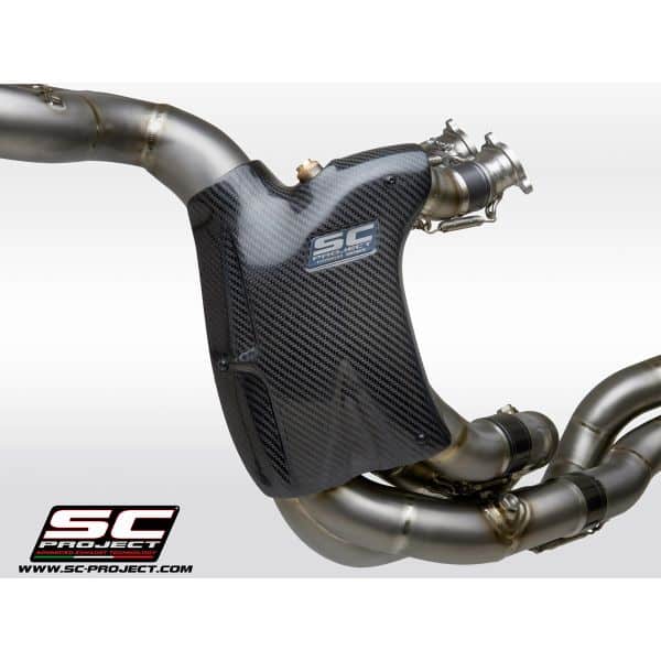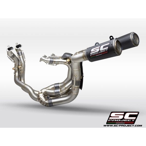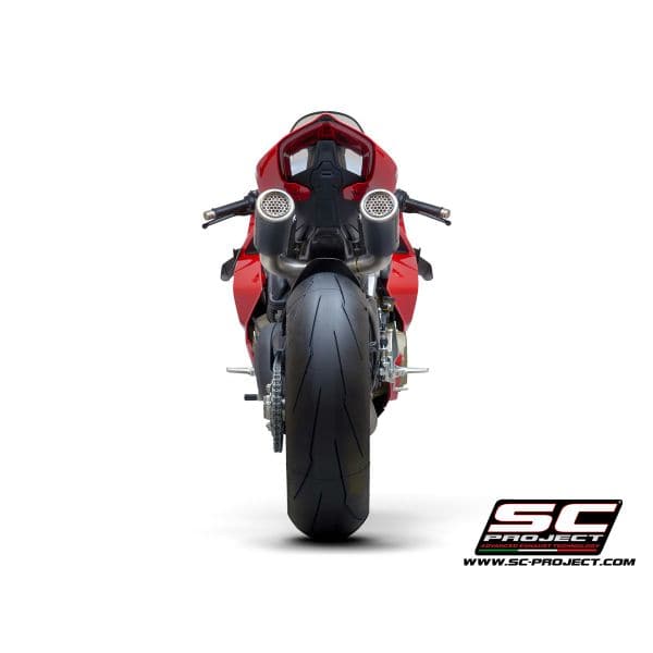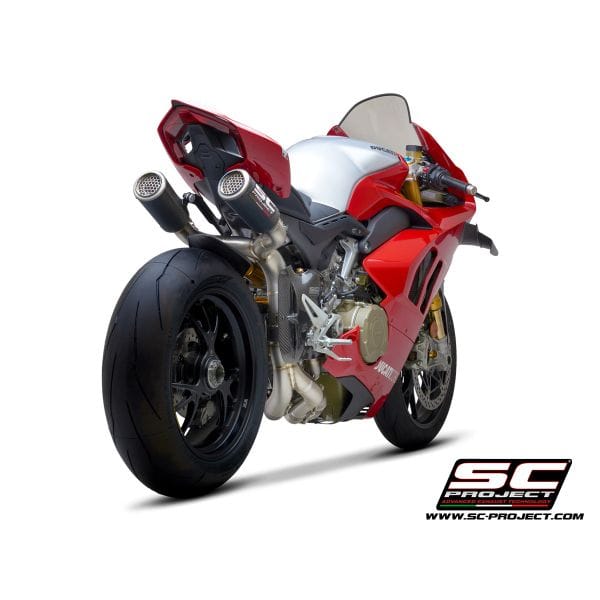 The full titanium 4-2-1-2 full exhaust system with double CR-T M2 for the new Ducati Panigale V4 derives directly from the experience by the SC-Project Racing Department in the WSBK World Championship. No compromise, maximum performance. For its realization we have used the best technologies. The four head attachments have the flanges completely machined from solid by CNC machining. The male and female bushings  are made of CNC machined titanium, in order to guarantee the best fit. The bushings also have a special treatment that protects against oxidation and reduces friction and allowing longer life to the hardest stresses. The complete is built entirely in reduced thickness titanium, with Tig welding performed in a controlled environment. It is supplied with lambda probe connections. The mounting springs have metal covers (no in rubber) to withstand the maximum stresses. The complete is supplied with the high resistance carbon mufflers model CR-T M2 with titanium mesh stone guard. A large autoclave machined carbon protection with a titanium insert is also provided. The kit includes all the small parts, the brackets for a plug and play assembly. The exhaust system is compatible with both 1100 and 1000 cc versions. For perfect performance, re-mapping of the ECU is recommended. The best performance with the best design for your Ducati Panigale V4.