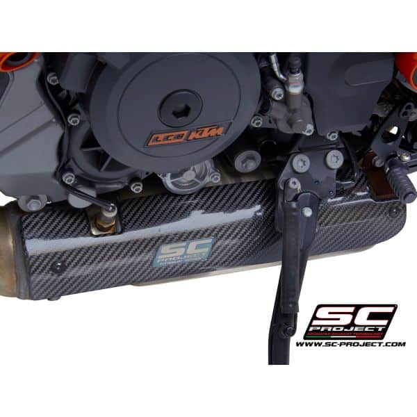 The R&D department of SC-Project has realized for KTM 1290 SUPER DUKE R a carbon fiber heat protection with shiny Twill weaving compatible with motorcycle’s original headers. La protection is compatible the entire range of SC-Project mufflers and the original mufller. The carbon protection gives the bike a Racing style, typical of the major MotoGp and WSBK competitions. To embellish the design of the protection is applied a Titanium insert with the lasered Logo. The kit comes with everything you need for mounting, making this product completely Plug & Play.