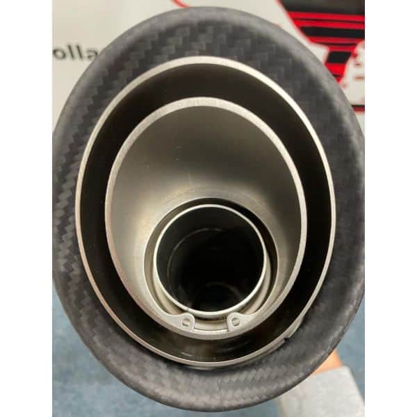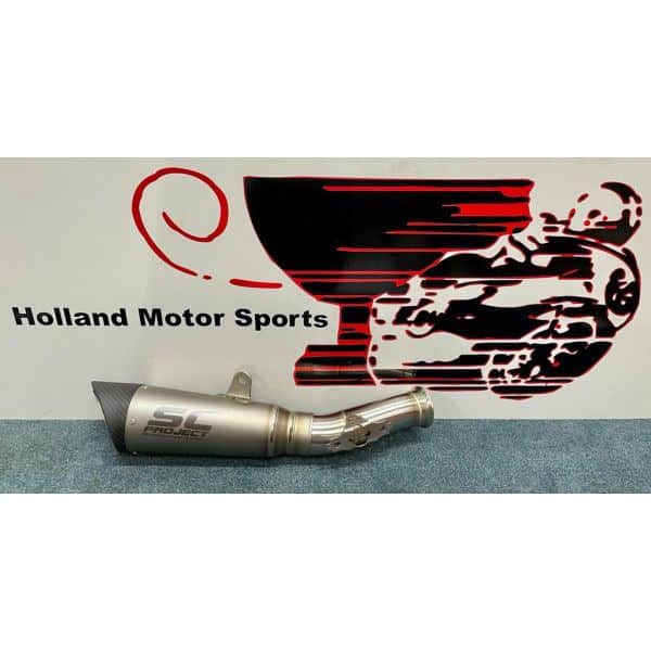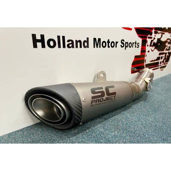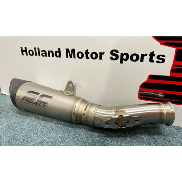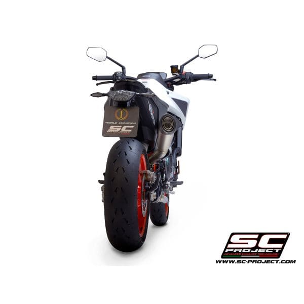 The S1 muffler represents for SC-Project the perfect combination of lightness and performance without compromise. Its conical shape with taut and essential lines make the S1 silencer fascinating giving outburst to Your KTM 890 Duke. Born from the experience of the racing department on the circuits of the WSBK Championship, the silencer has a Titanium body with Carbon end cap with a special sound-absorbing material that resists high temperatures. To make it unique and unmistakable our Technicians have used the best production processes: brackets and fittings welded with T.I.G. technology, the insert bushings in titanium made in CNC and lasered Logo. From the high and powerful sound the S1 silencer will make the Sound of Your Moto unique. In the kit is included the carbon heat protection.