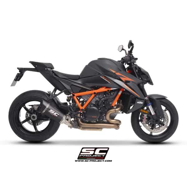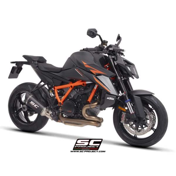 To allow you to enjoy every beat of the biggest twin cylinder on the market, we developed a specific version of our most technologically advanced product: the SC1-R slip-on muffler. For the KTM 1390 Super Duke R, the SC1-R allows a sensible weight reduction of over -30% (-1.0 kg if compared to the OEM exhaust) and to get an incredible maximum gain of 2.0 hp at 7900 rpm and 1.9 Nm of torque at 7900 rpm, together with a stable improvement of power and torque delivery in the low and mid range. For the KTM 1390 Super Duke R, this exhaust comes in Euro 5+ compliant version: everything has been developed to offer a superb sound experience in full compliance for street legal use. Everything about this silencer has been made to offer the highest quality and performance experience: the best materials with advanced production process like handcrafted TIG weldings, sound-absorbing material resistant to very high temperatures, the asymmetrical outlet obtained with hydroforming technology and finally the unique and sporty carbon fibre end cap. 100% Made in Italy technology and design make this silencer the top quality level of SC-Project products range. The SC1-R muffler is a real piece of art The silencer’s body is available in two options: high quality carbon fibre or ultralight titanium. Both versions are enriched by a precious aluminium riveted plate, the same used for the exhausts made by SC-Project Reparto Corse. The kit is completely plug and play and it is enriched by a specific high quality carbon fibre heat shield. ECU remapping is not necessary.