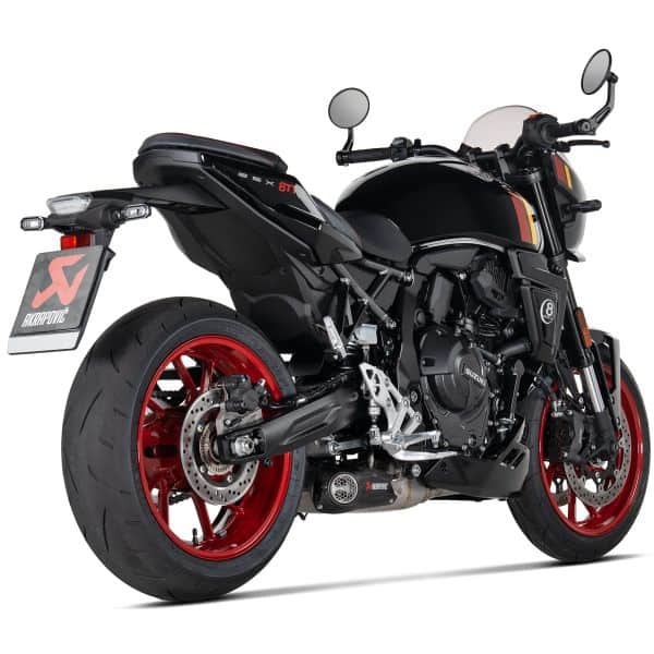 Inspired by the concept shown at EICMA in 2024, this exhaust has been designed to seamlessly integrate with the bike’s lines. Constructed in one piece from high-grade stainless steel and shaped through the use of high-end technology, with the catalytic converter welded inside the muffler. It is finished with a handmade carbon-fibre cover, which incorporates the outlet with a honeycomb exhaust protection and an Akrapovič logo in red and white.