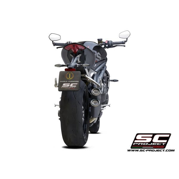 The Twin CR-T, derived from the iconic Moto 2 exhaust, is available in titanium or carbon fiber. Designed and developed to give a sporty character to your Triumph Speed Triple 1200 RS. A deep and dark sound, unique in the panorama of aftermarket silencers. The Twin CR-T combines its racing look with some first class technical and aesthetic solutions: the use of materials derived from the aeronautical industry, such as titanium or carbon fiber with dedicated treatment to withstand very high temperatures and welding of the bracket and fitting with TIG technology, make it the perfect silencer to enhance the line of your bike.