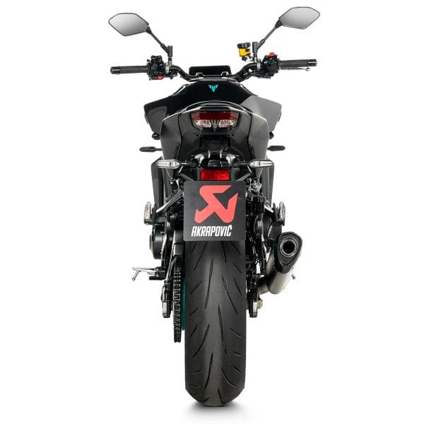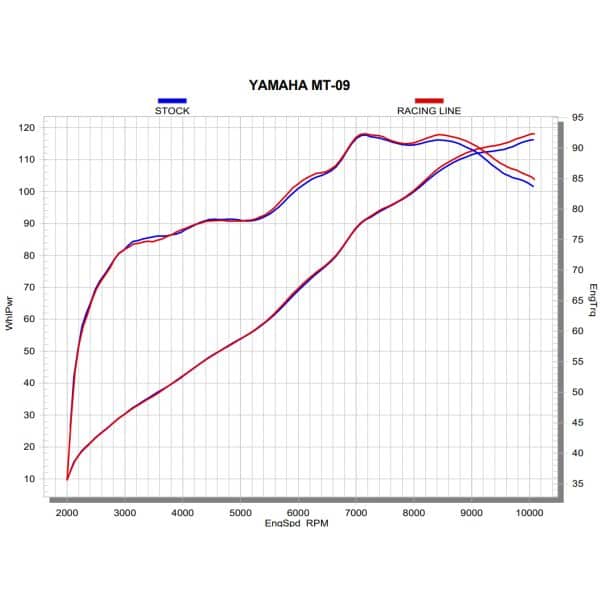 The new design features a shorter muffler for an enhanced sporty look, which exits on the side of the bike for visual impact. Power is increased by 1.5 kW (2.0 hp) at 10,000 rpm and torque is up by 1.3 Nm at 9,700 rpm when compared in back-to-back tests on a Tracer 9 with a Racing Line (Titanium) exhaust and with a standard stock exhaust system. It creates a deep and intense sound.