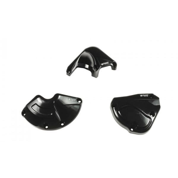 Made of high-strength aluminum alloy, machined from solid with CNC technology and finished with black anodizing, the kit perfectly protects the carters of the motorcycle in the event of any falls.