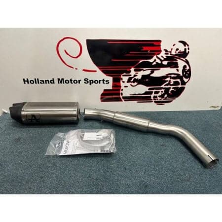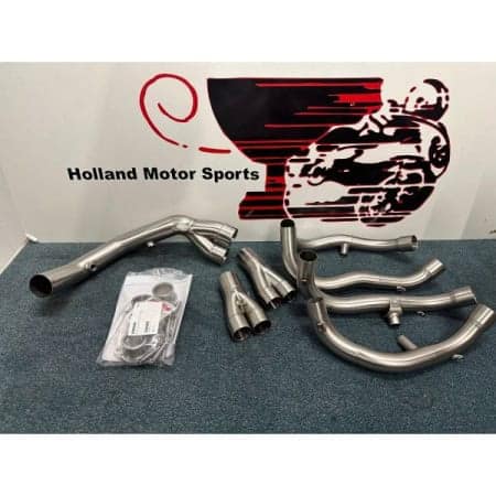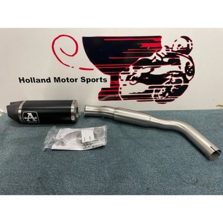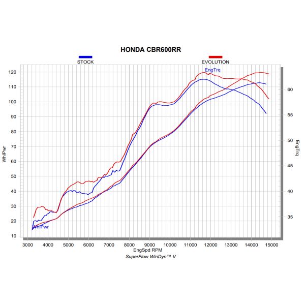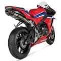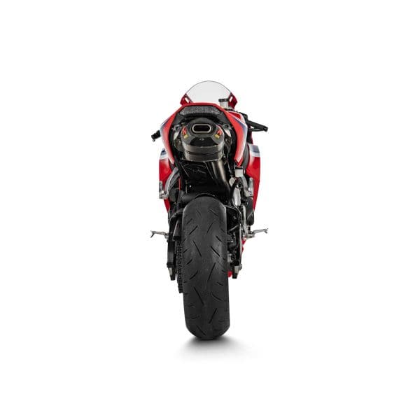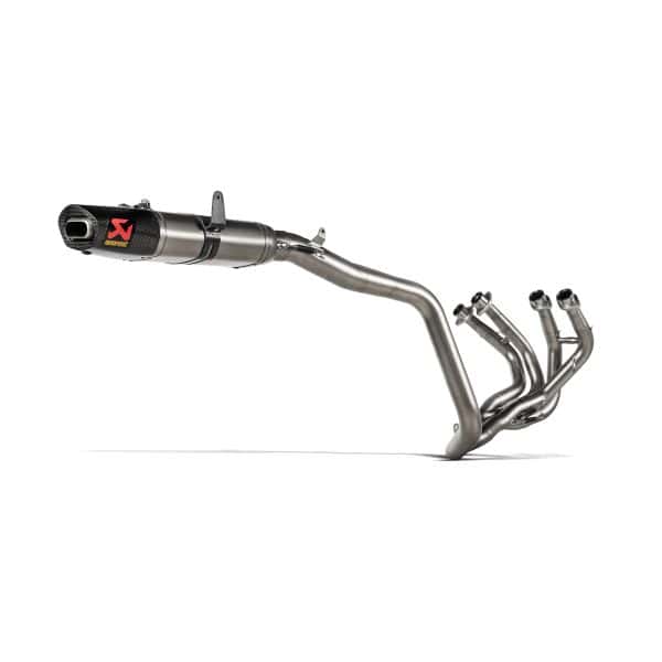 This is a full system constructed from high-grade lightweight titanium and finished with a carbon-fibre end cap. The headers have been optimized to increase performance. This track-oriented exhaust system mainly focuses on weight reduction and increased performance, allied to a racing sound. The use of race-proven materials results in a weight reduction of 52.6% (4.7 kg) over the standard stock exhaust system. It delivers power and torque increases of 5.2 kW (7.1 hp) at 14,000 rpm and 2.7 Nm at 6,000 rpm, respectively, when compared to a Honda CBR600RR equipped with a standard stock system and tested on the Akrapovič dyno, with power gains noticeable in the mid and high rev ranges. During development, the engineers focused on throttle response and rideability for a system that has been designed for use on closed-course competition circuits only.