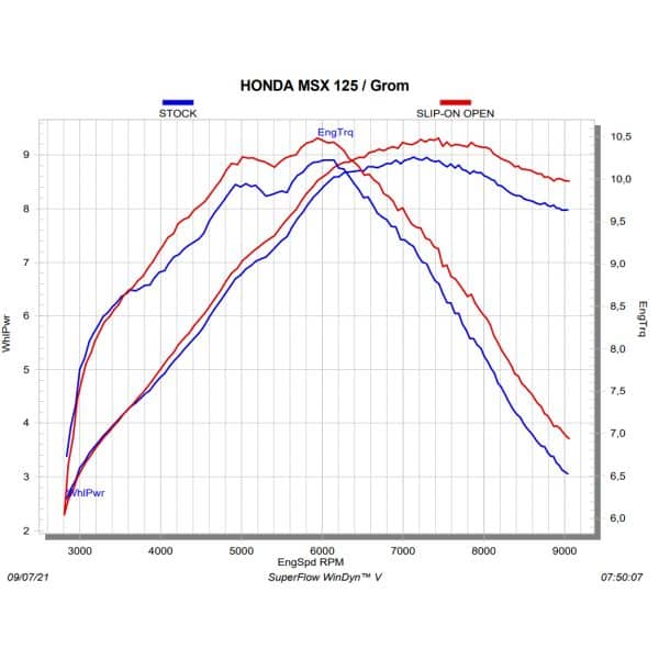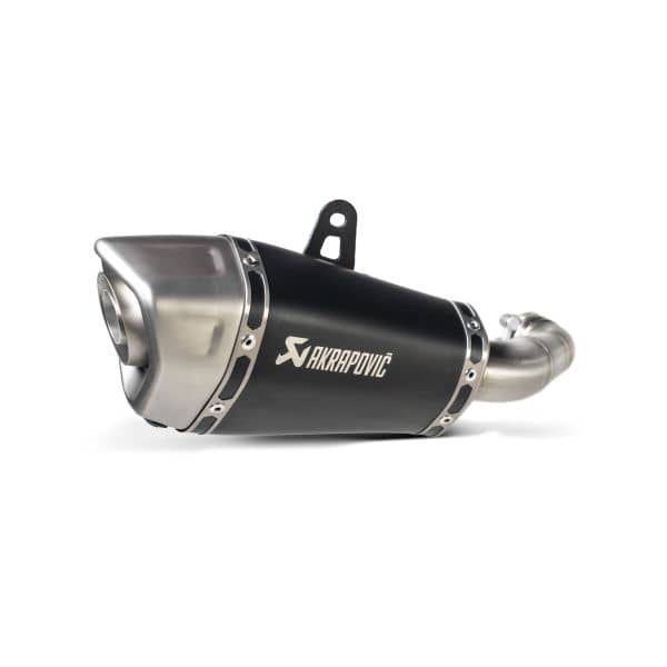 Featuring a new design, perfectly sculpted to follow the lines of the bike and offer a racing look, the Slip-On Line’s innovative conical muffler is black and has a laser-engraved logo for increased visual effect. Produced using race-proven materials, the end cap and the outer sleeve are lightweight titanium, and high-grade stainless steel is utilized for the link pipe, giving the exhaust a weight savings of over 36% compared to the standard stock version. A clear enhancement in performance is achieved through the exhaust, with perfect throttle response across the rev range and power gains of 5.8% at 8,500 rpm, with torque increased by 4.3% at 5,350 rpm when tested on the Akrapovič dyno against a Honda MSX 125 with a standard stock exhaust. All of this is allied with the distinctive deep Akrapovič sound. It features easy plug-and-play installation, and no remapping is required. This exhaust is meant for racetrack and closed course use only. An optional stainless-steel header and carbon-fibre heatshield are also available.