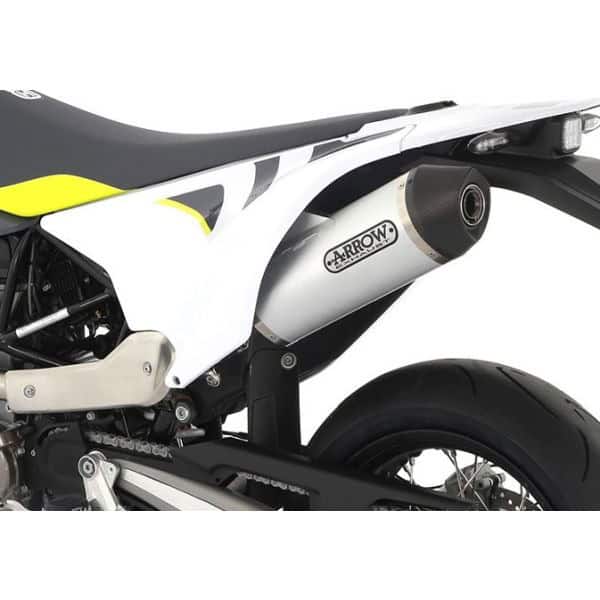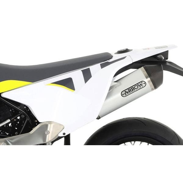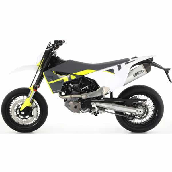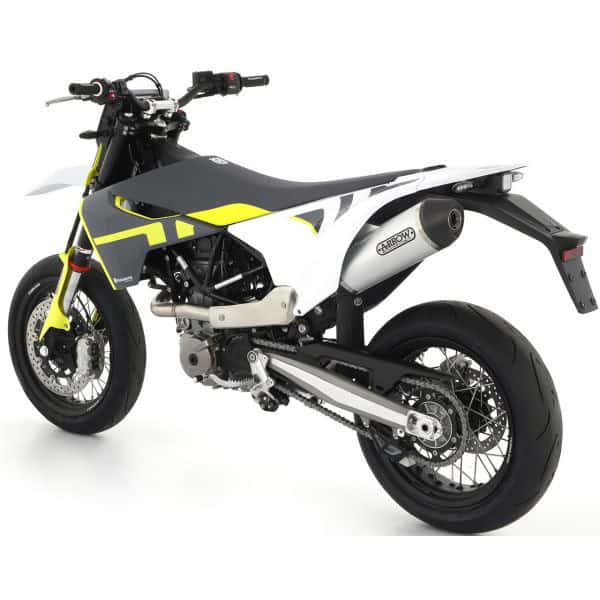 Arrow has been supplying high quality exhausts for over 20 years. Neatly finished, lighter than the original exhausts, but also more beautiful and better sound. Arrow exhaust for the Husqvarna 701 Enduro/ Supermoto 2021 Aluminium Race-Tech muffler with a carbon end cap 72623AK. The silencer is EU approved and has a removable dB killer. The approval is engraved on the silencer and comes with a certificate. This silencer comes with the new Arrow logo with the black background with yellow letters, as can be seen in the first 4 photos. The silencer comes with a Racing linkpipe 72175PD. The silencer will fot the original collectors because of the link pipe The link pipe eliminates the catalytic converter. The bike will maken more noise There is also a option for a sportcat 72175PZ The link pipe therefore contains an approval and it also has a certificate. With the link pipe comes a sportkat With the sports catalytic converter, the exhaust also makes more noise than with the original exhaust, but less than without a catalytic converter.