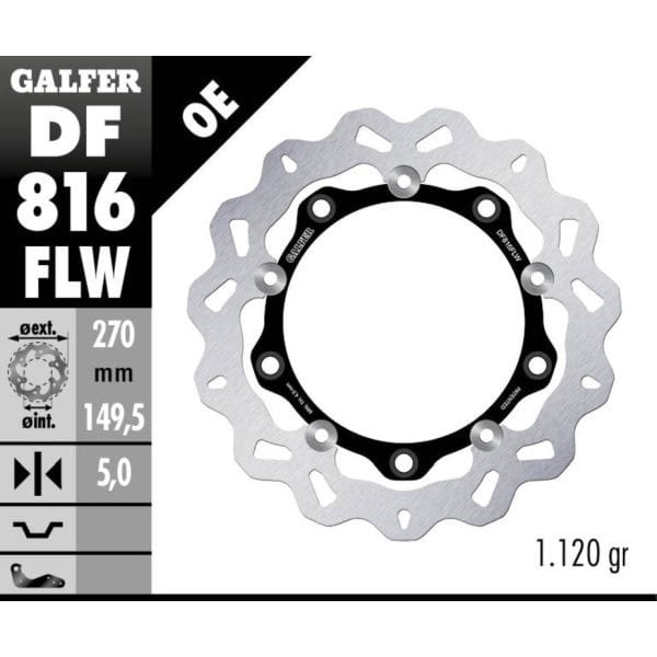 De remschijf is voor de voorzijde. Het is een WAVE FLOATING (C. STEEL) schijf en de afmeting is 270 x 5mm.