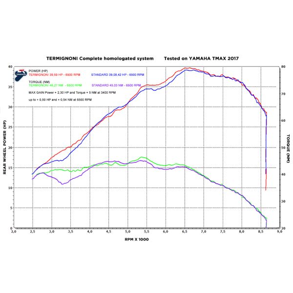 The max gain in terms of performance is +2,30 Hp at 3.400 rpm and offers an increase of power + 0,50 Hp at 6.500 rpm and torque + 0,54 Nm at 6.500 rpm.