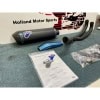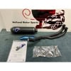 one racing silencer in titanium racing black silencer, carbon end cap, blu clamps on the sleeve, inlet in stainless steal with black painting and the classic Metal Logo on the sleeve of the silencer.
