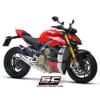 The S1 muffler represents for SC-Project the perfect combination of lightness and performance without compromise. Its conical shape with taut and essential lines make the S1 silencer fascinating giving outburst to Your Ducati Streetfighter V4. Born from the experience of the racing department on the circuits of the WSBK Championship, the silencer has a Titanium body with Carbon end cap with a special sound-absorbing material that resists high temperatures. To make it unique and unmistakable our Technicians have used the best production processes: brackets and fittings welded with T.I.G. technology, the insert bushings in titanium made in CNC and lasered Logo. From the high and powerful soundtheS1silencer will make the Sound of Your Motounique. For perfect performance, throttle response and durability, ECU remapping is recommended. The best performance with the best design for the Ducati Streetfighter V4.